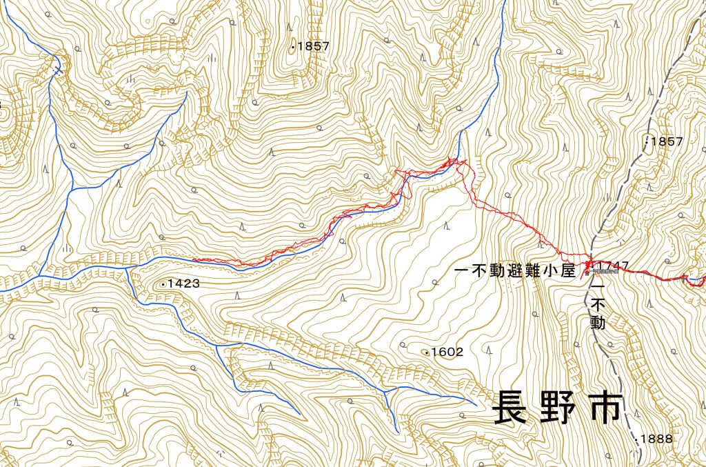 昼を少し過ぎたところなので、翌日のために偵察に出かけることにした。といっても約1年前に二俣まで行っているので大体のことは覚えている。今回は沢靴をもってきていないので、時間がどのくらいかかるかも含めて、標高点1423m近くまで行ってみることにした。