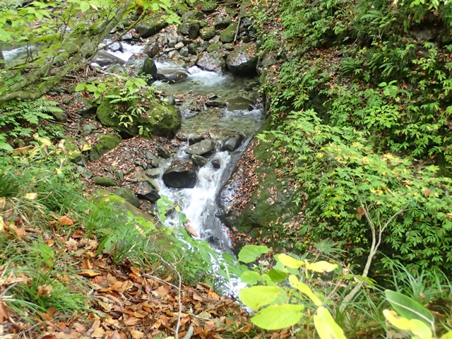 一不動小屋の側から笹薮に突っ込んだ。いつも通りだが結構大変。持参したナタが強い味方となってくれた。激薮から抜け出し、後は歩きやすいところを選びながら1.5時間かかって裾花川源流に降りたった。手前に黒滝があるが、翌日に回すことにした。