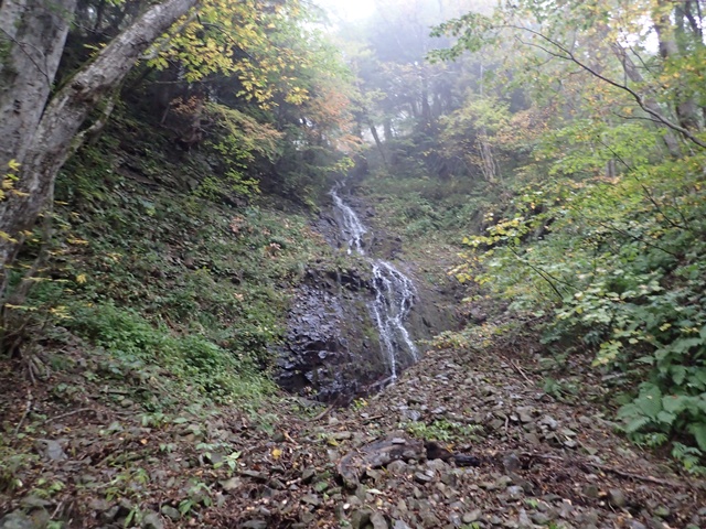 テン場から約1時間で対岸にある標高点1423mのところまで来た。ここから左岸の斜面に取り付いて、裾花川源流の奥の二俣まで行くのだ。