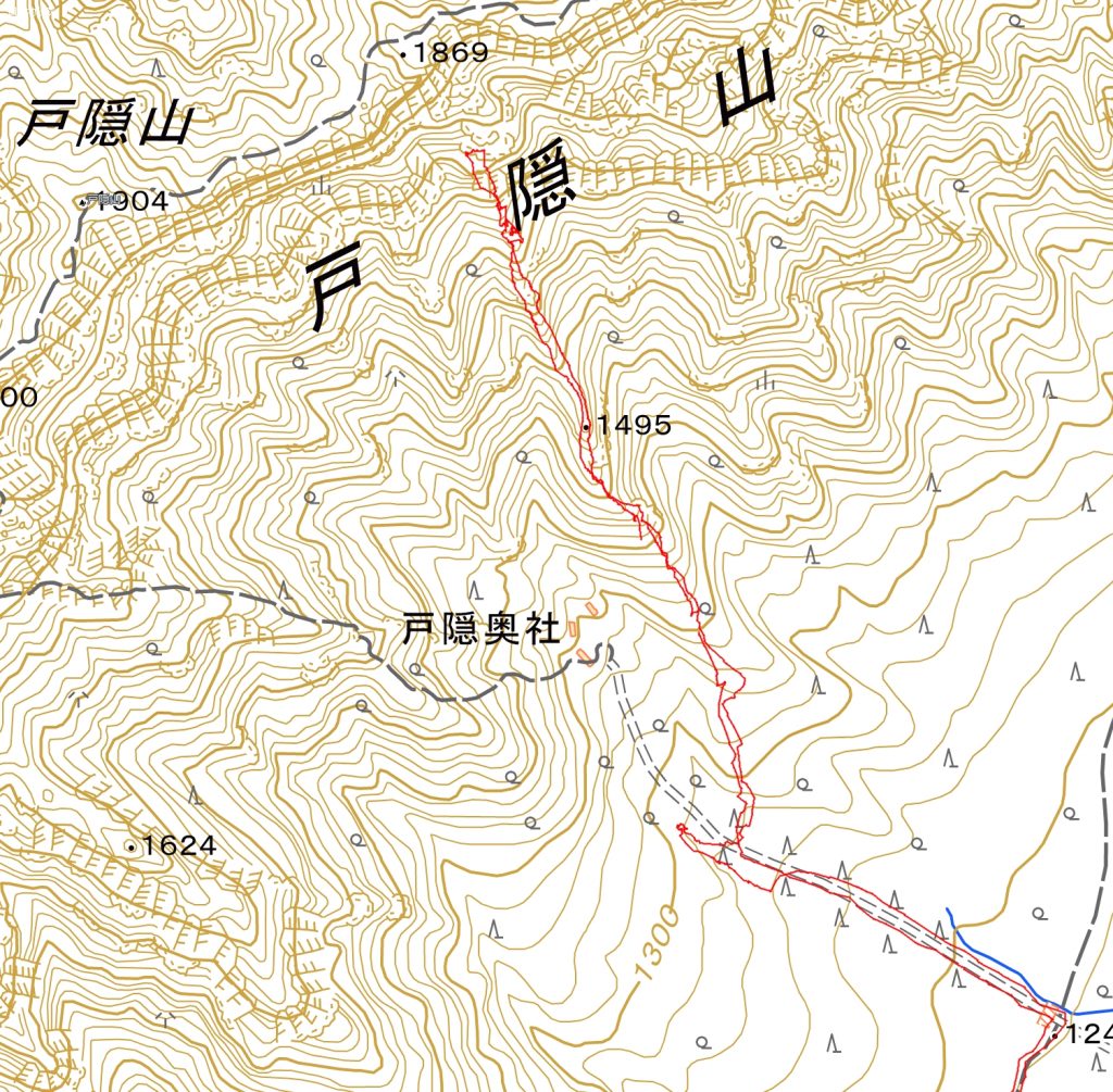 西に見える尾根は、奥社本殿の裏の沢から入り、途中尾根に取り付くルートになるか!今回はここでやめておくことにした。今日はまだ東窟にまだ行ってなかったので東窟経由で下山することにした。