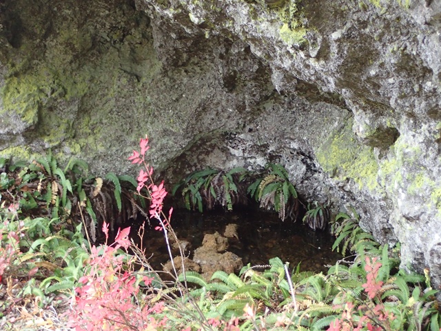 岩壁に沿って少し進むと東窟が現れた。正面の窟には「赤水」がある。直径1m位の窪みができていて、水が溜まっている。左の窟が東窟。