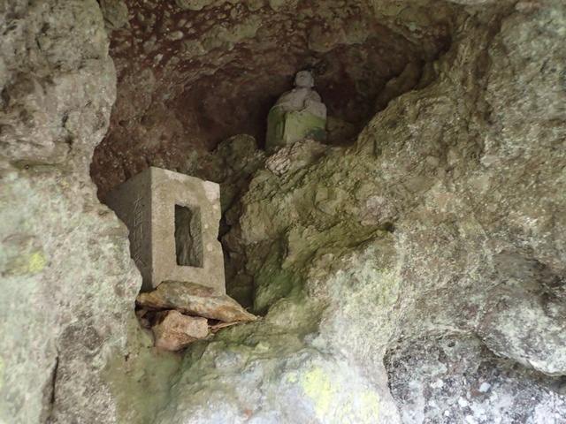 東窟。弘法大師の座像と屋根のない石祠が安置されている。石祠にも文字が刻まれていたがよく分からなかった。