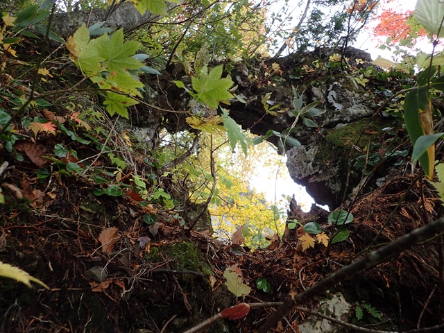 日中窟から上に登り上げ、尾根を忠実に登って行った。岩壁に突き当り、岩壁に沿って西に向かって移動していく。前回もここまでは来ていたが、中窟のことを意識することなく引き返している。