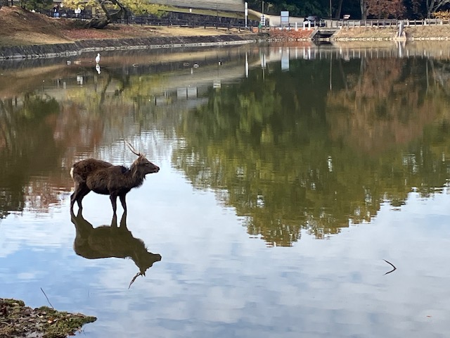 正倉院の南にある大仏池には鹿が。