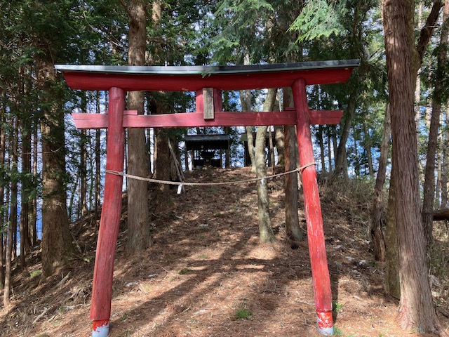 点名・大田原から少し西に進むと目の前にピークが立ちはだかった。そのピークから尾根を下る予定だったので、ピーク目指して登って行ったら、なんと神社があった。