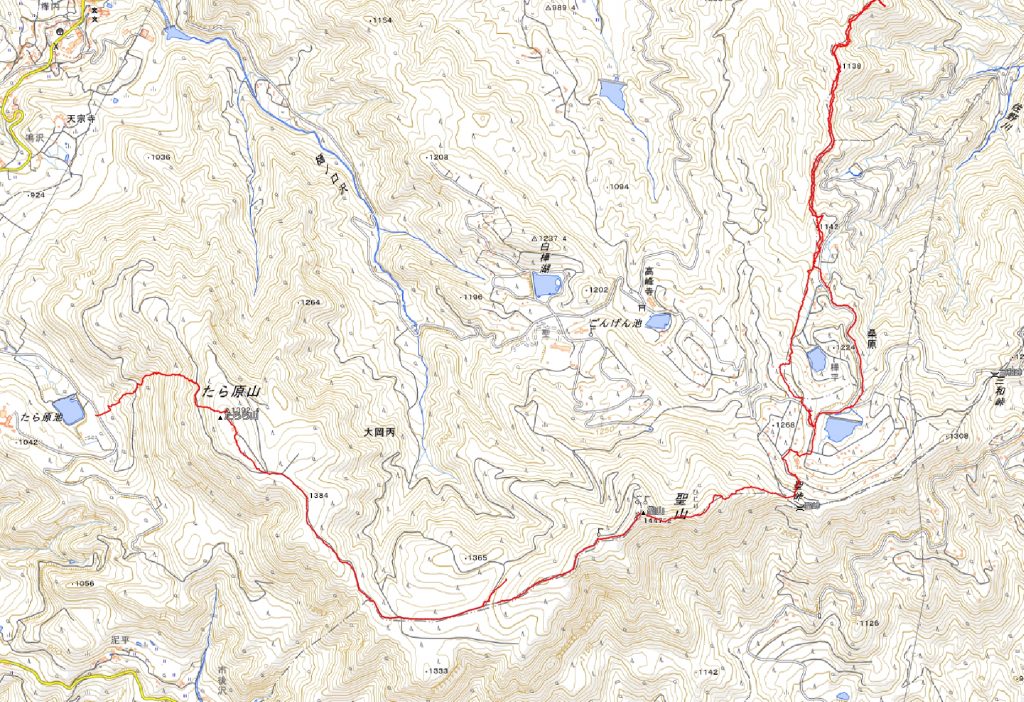 前回の登山は高雄山から標高点1138mのピストンだった。だから今回は、標高点1138mから聖山を経由してたら原山を縦走し、たら原池に下山する計画をした。