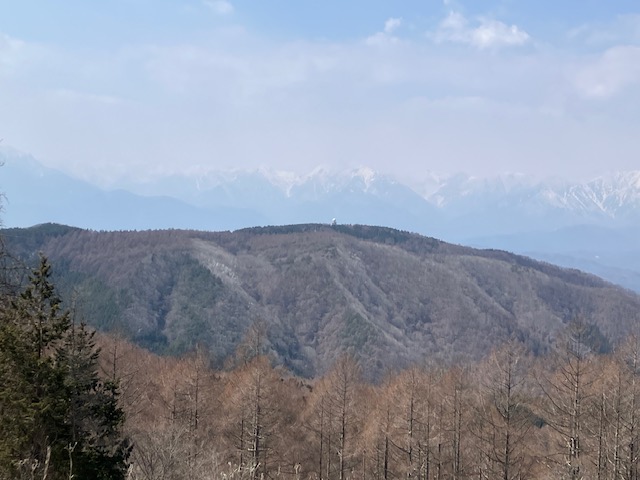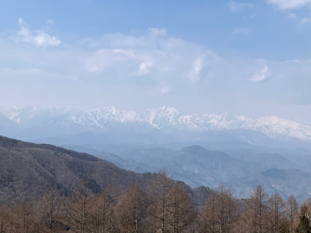 春霞で北アルプスは見えてはいるが前回のようにはっきりとは確認できない。