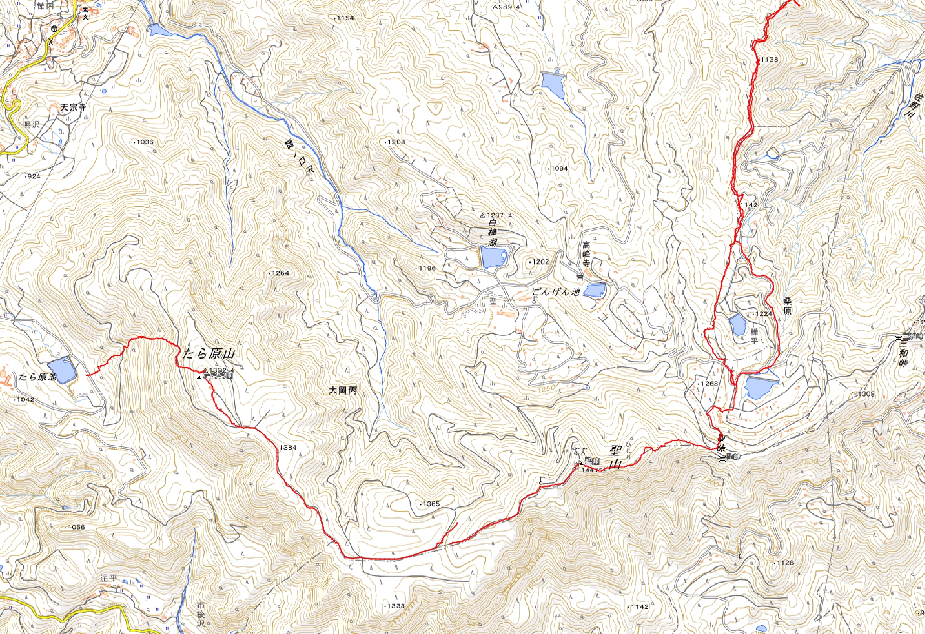 前回の登山は高雄山から標高点1138mのピストンだった。だから今回は、標高点1138mから聖山を経由してたら原山を縦走し、たら原池に下山する計画をした。
